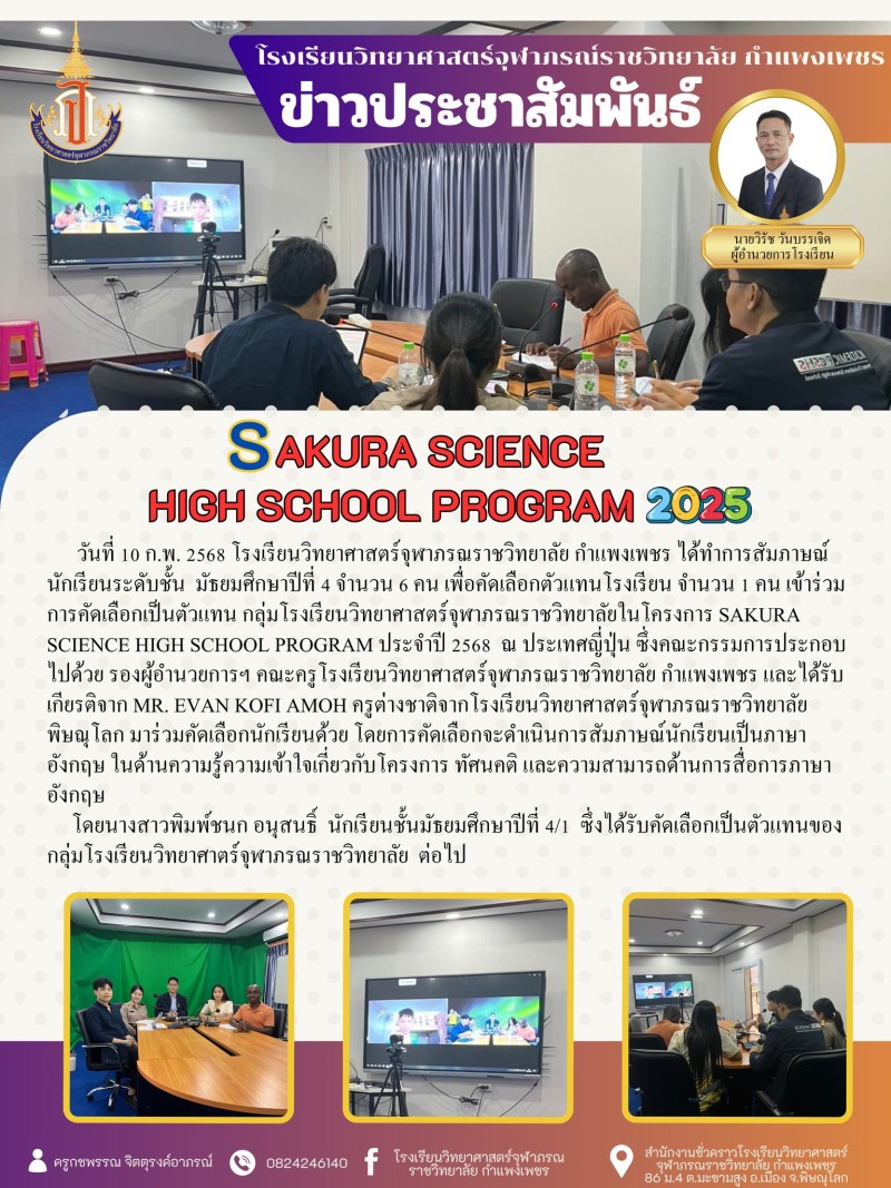 เข้าร่วมการคัดเลือกเป็นตัวแทน กลุ่มโรงเรียนวิทยาศาสตร์จุฬาภรณราชวิทยาลัยในโครงการSAKURA Science High School Program ประจำปี 2568 ณ ประเทศญี่ปุ่น ซึ่งคณะกรรมการ