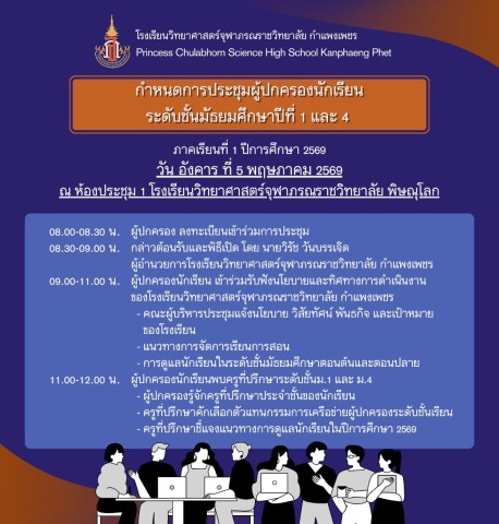 ขอเชิญผู้ปกครองนักเรียนชั้น ม.1 และ ม.4 เข้าร่วมการประชุมผู้ปกครองนักเรียนใน วันอังคาร ที่ 5 พฤษภาคม พ.ศ.2569