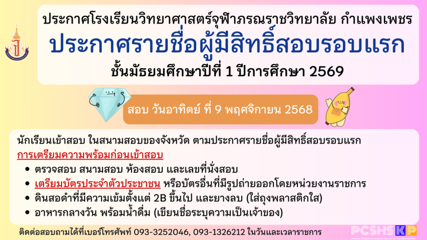ประกาศรายชื่อผู้มีสิทธิ์สอบคัดเลือกรอบแรก เข้าเรียนชั้นมัธยมศึกษาปีที่ 1 โรงเรียนวิทยาศาสตร์จุฬาภรณราชวิทยาลัย กำแพงเพชร ปีการศึกษา 2569