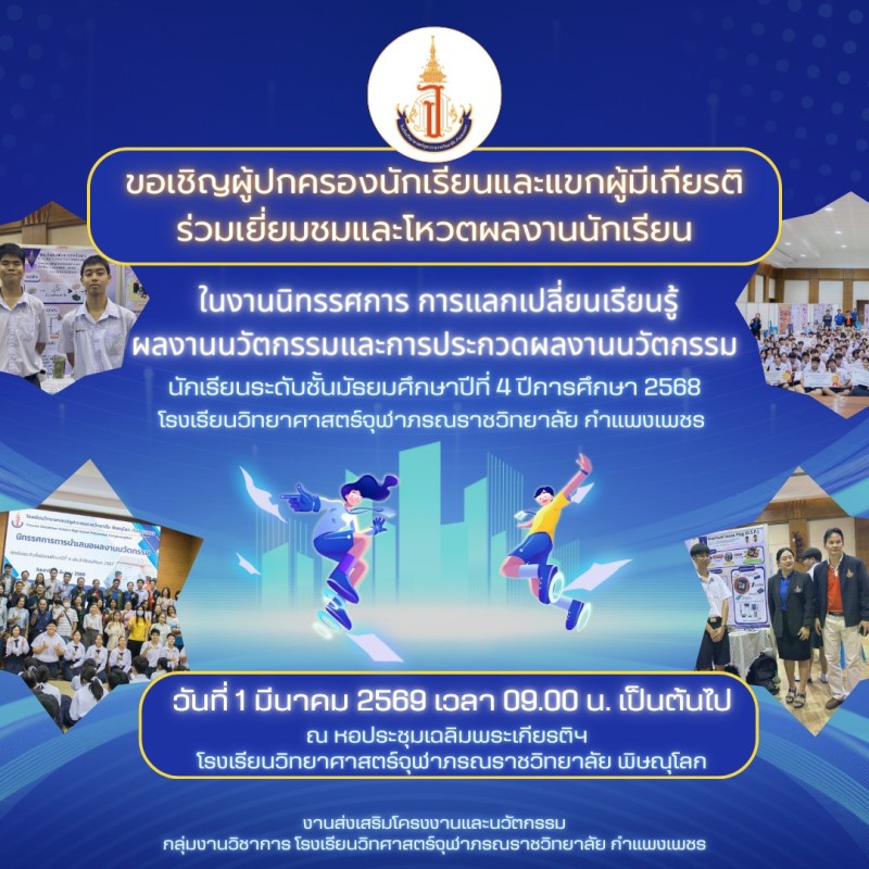 โรงเรียนวิทยาศาสตร์จุฬาภรณราชวิทยาลัย กำแพงเพชรขอเชิญผู้ปกครอง นักเรียน และแขกผู้มีเกียรติ ร่วมงานนิทรรศการ ก...