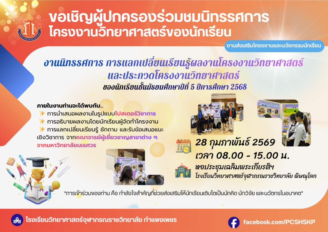 ขอเชิญผู้ปกครอง นักเรียน และแขกผู้มีเกียรติ ร่วมงานนิทรรศการ การแลกเปลี่ยนเรียนรู้ผลงานโครงงานวิทยาศาสตร์ และการประกวดโครงงานวิทยาศาสตร์ ของนักเรียนระดับชั้นมัธยมศึกษาปีที่ 5 ประจำปีการศึกษา 2568