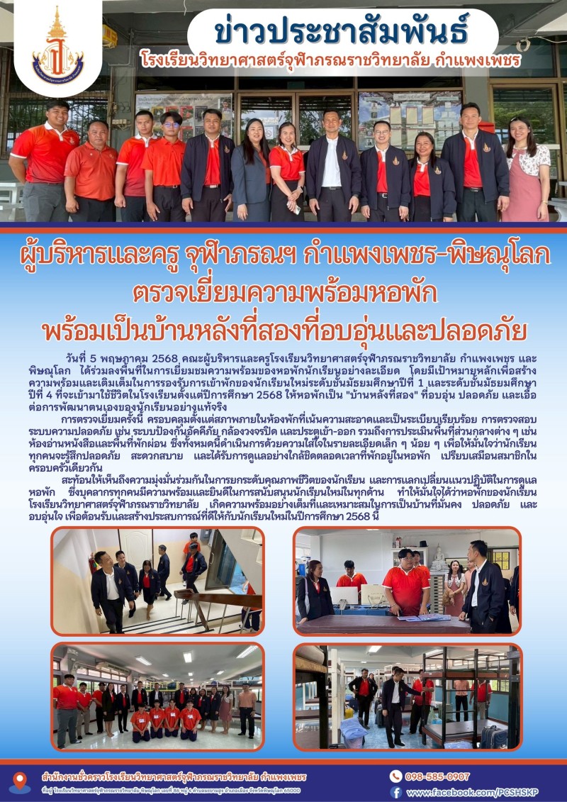 วันที่ 5 พฤษภาคม 2568 คณะผู้บริหารและครูจากโรงเรียนวิทยาศาสตร์จุฬาภรณราชวิทยาลัย กำแพงเพชรและพิษณุโลก ได้ร่วมกันลงพื้นที่ตรวจเยี่ยมความพร้อม