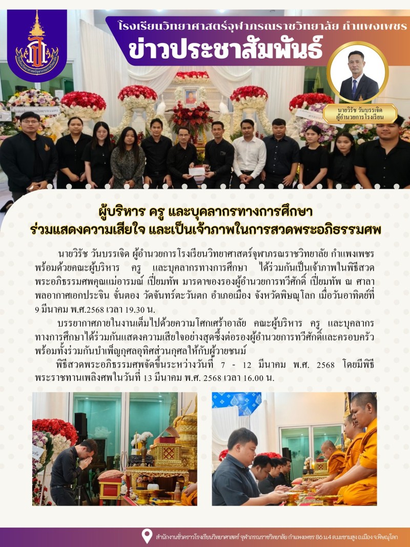 เมื่อวันอาทิตย์ที่ 9 มีนาคม พ.ศ.2568 เวลา 19.30 น. ผู้บริหาร ครู และบุคลากรทางการศึกษาโรงเรียนวิทยาศาสตร์จุฬาภรณราชวิทยาลัย กำแพงเพชร