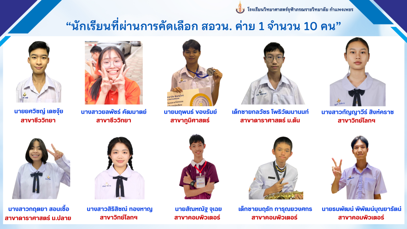 นักเรียนที่ผ่านการคัดเลือก จากมูลนิธิส่งเสริมโอลิมปิกวิชาการและพัฒนามาตรฐานวิทยาศาสตร์ศึกษา(สอวน.) ค่าย 1 ปีการศึกษา 2568 จำนวน 10 คน